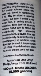 There is an odor that emanates from the Seachem Prime bottle. It's not exactly pleasant but it doesn't make its way into the aquarium. In addition, extra Prime that may linger on the bottle will crystallize into a salt-like substance and can cause a small mess - so wipe off the bottle after use if there is even a slight evidence of spillage. Seachem claims that each 5 ml dose will remove approximately 0.8 mg/L of ammonia and 1.2 mg/L of chloramine or 3.3 mg/L of chlorine. It may also be used to dtoxify nitrite in emergency situations.